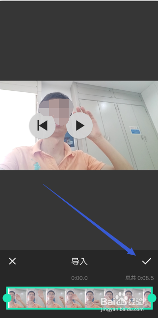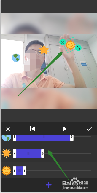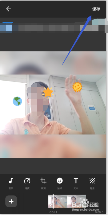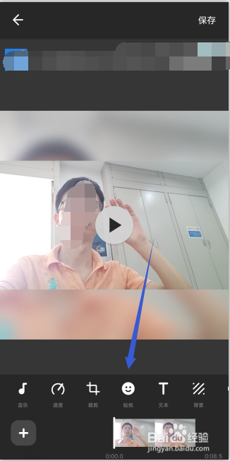 接下来进入到视频预览页面,点击右侧√,返回到视频编纂界面,点击此中的脸色贴纸按钮选项,如下图所示。