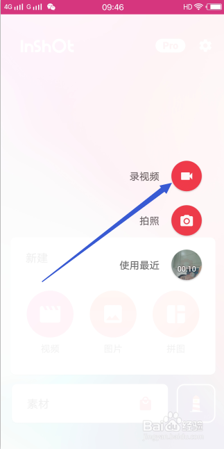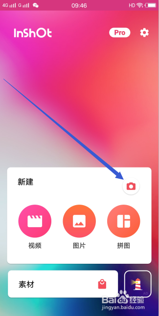 接下来,打开手机中已经安装好的Inshot应用,进入到首页后,选择点击此中的拍摄按钮图标,就是相机一样的图标,如下图所示。