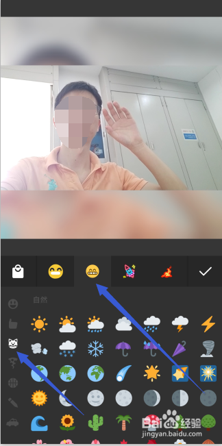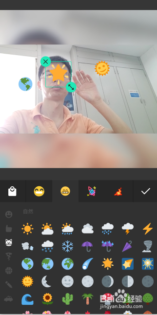 然后选择如下图指示的脸色内容,星球在天然分类里面,若是没有,需要先下载所有的贴纸才可以。