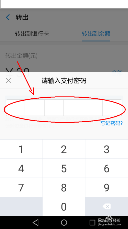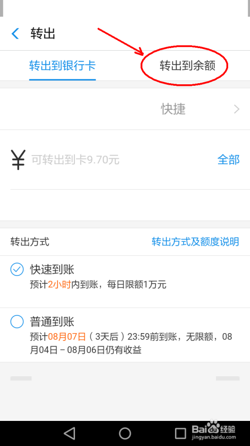 在转出页面有”转出到银行“和”转出到余额“,点击”转出到余额“。(如下图)