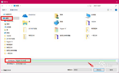 在打开的另存为窗口中,先点击窗口左侧的【桌面】,在文件名(N)栏中输入:Hyper-V.cmd,再点击:保留;