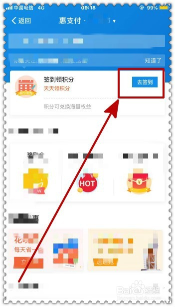 进入惠付出页面中,可以看到签到领积分的详情,点击“去签到”按钮,打开进入下一步操作,如下图示。