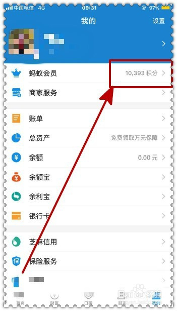 然后进入“我的”菜单中,可以看到付出宝积分总数,如下图示。