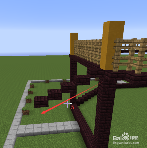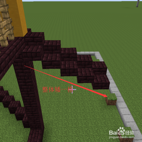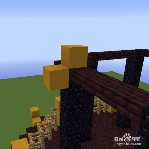 然后以黄色柱子为基准标的目的内收一格,标的目的后收三格的位置起头铺8格高的柱子。(这里为了大师看的便利我用的黑曜石,在游戏中你可以用地狱砖。)