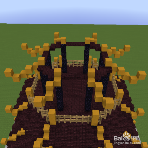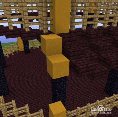 中心区域填满地狱砖,然后从黄色柱子标的目的内收一格,标的目的前推3格的区域放8格高的黑曜石。黑曜石上面再放3格黄色粘土。
