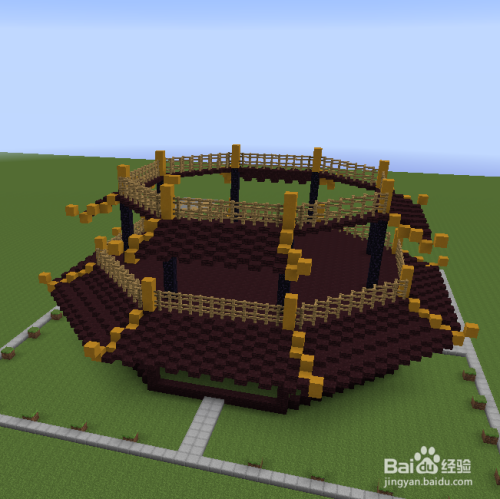 在八格的地狱砖上面再提高三格的黄色粘土。然后用地狱半砖跟第一层一样的做法毗连当作八边形,并在上面放置木栅栏。