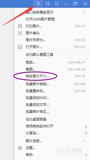 接着,点击右上角的三条横线,也就是菜单按钮,选择此中的点窜图片尺寸,或者同时按下键盘的CRL+E,