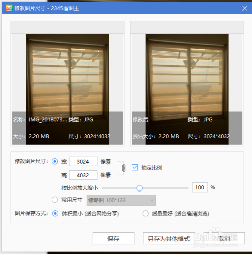 弹出点窜尺寸的对话框,输入想要设置的图片像素大小,建议锁定比例,右侧可以显示预览图片的大小,最后点击保留,即可完当作。