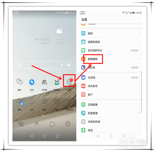 利用该方式,需要开启分屏手势功能。开启方式:在华为P20手机桌面上,如下图所示点击“设置”选项,在新打开的设备页面,找开并点击“智能辅助”选项。