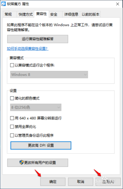 回到 软媒魔方 属性 - 兼容性窗口中,点击:应用 - 确定( 必然要进行此步操作,不然无效);