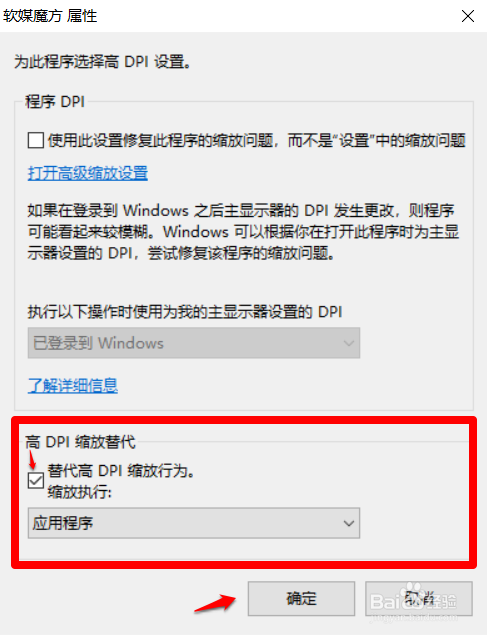 此时又打开一个新的 软媒魔方 属性窗口 - 为此法式选择高 DPI 设置,我们找到 高 DPI 缩放替代栏,在 替代高 DPI 缩放行为前的复选框内打勾,再点击:确定;