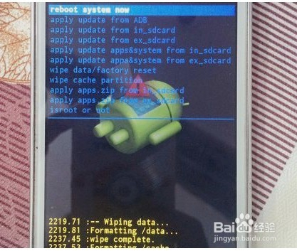 7、大要几秒钟,顿时又会弹出recovery模式最初界面,然后选择reboot system now(一般默认这一项,不需要从头选择。)按开机键确认重启手机。