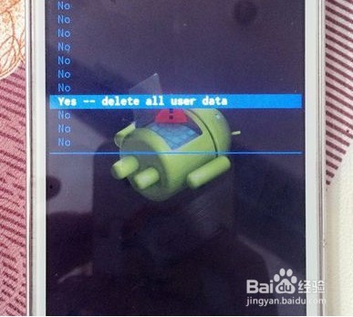 4、同样,利用音量加减键选择yes--delete all user data,按开机键确认;