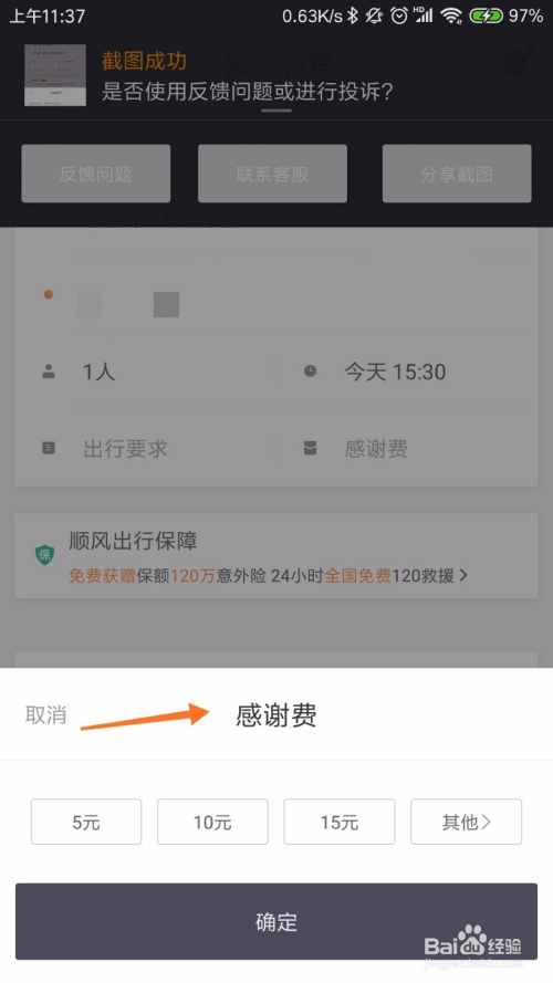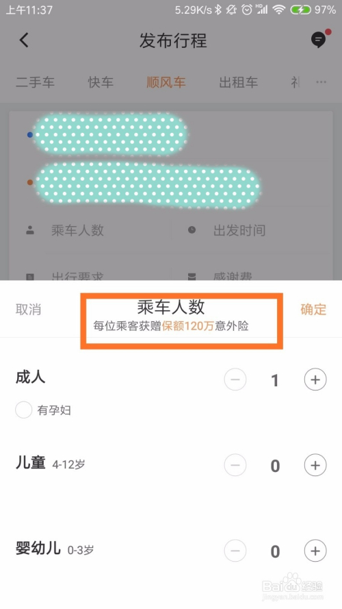 接下来,我们填写好搭车人数,若是比力焦急的话,可以给滴滴出行司机一些感激费,可以尽快打到顺风车,如下图所示。