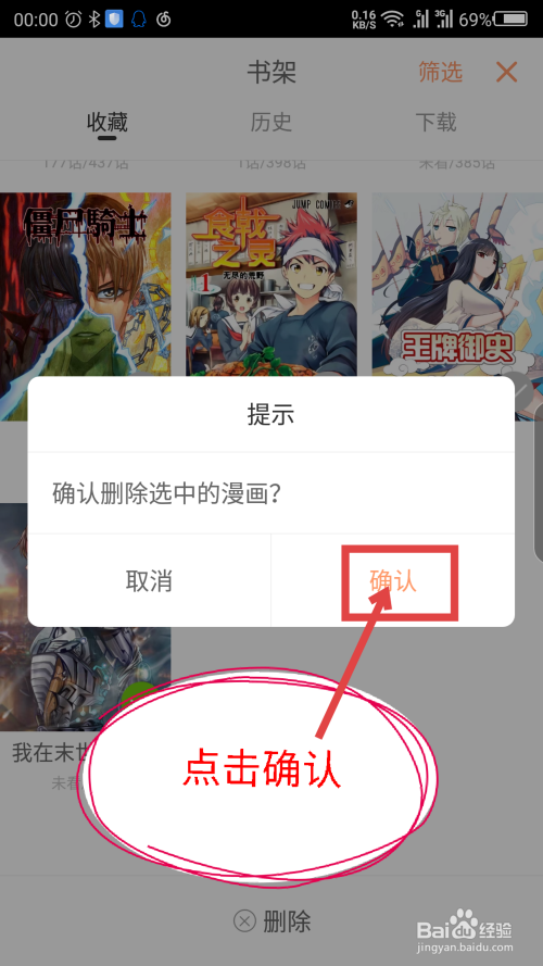 点击删除会弹出一个提醒窗口,点击右边简直认删除漫画。操作如截图所示