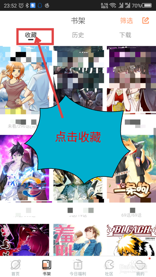 在书架界面,分为保藏汗青和下载三个菜单,点击第一个保藏。操作如截图所示