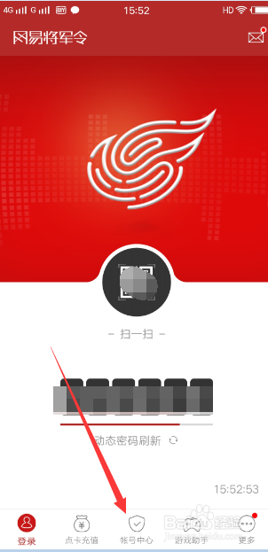 首先,打开手机中已经安装好的网易将军令APP,进入到首页傍边,点击底部中心位置的【账号中间】,如下图所示。