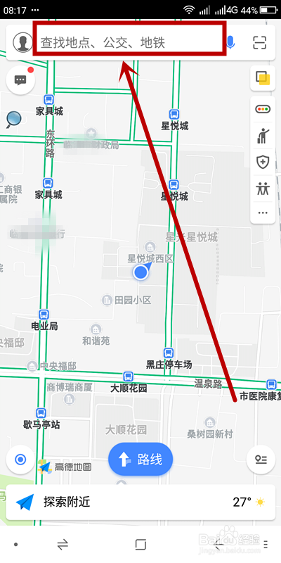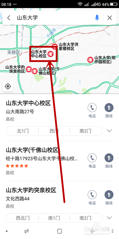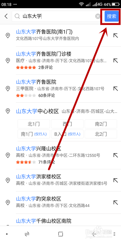 在地图上查找本身的目标地,选择好后点击。我们选择“山东年夜学中间校区”