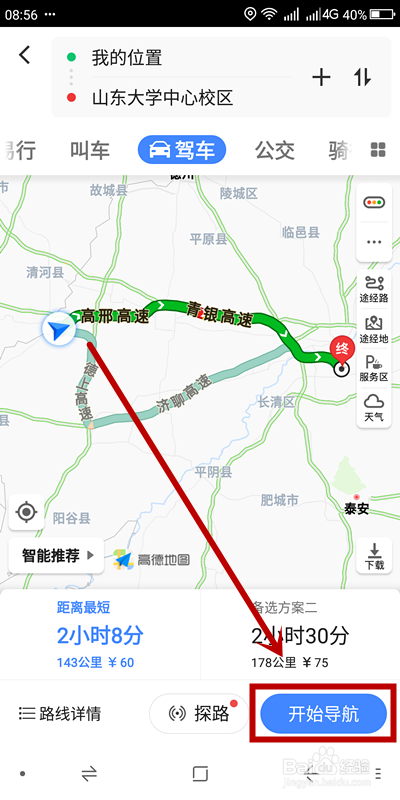 在页面下方选择“起头导航”点击,我们就可以按照导航来驾车出门了。