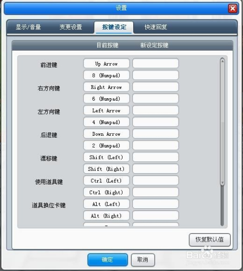 在这个选项卡中,可对游戏中的操作快速键,进行从头设定。操作方式:将光标移动到要从头设置功能的空白文本框中,然后下要设置当作的新键即可。这个一般不消点窜。