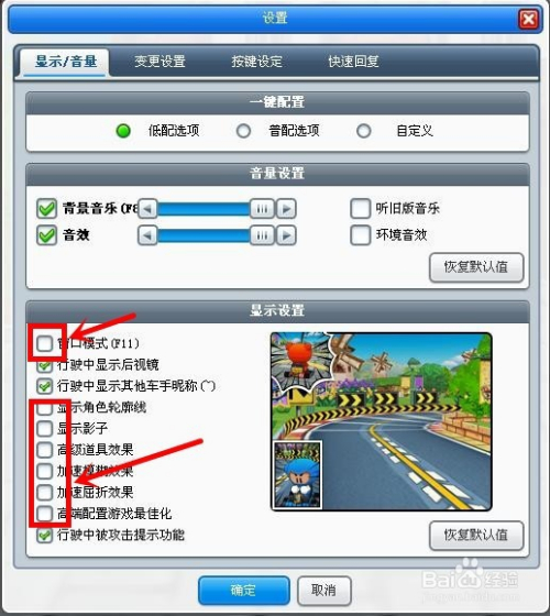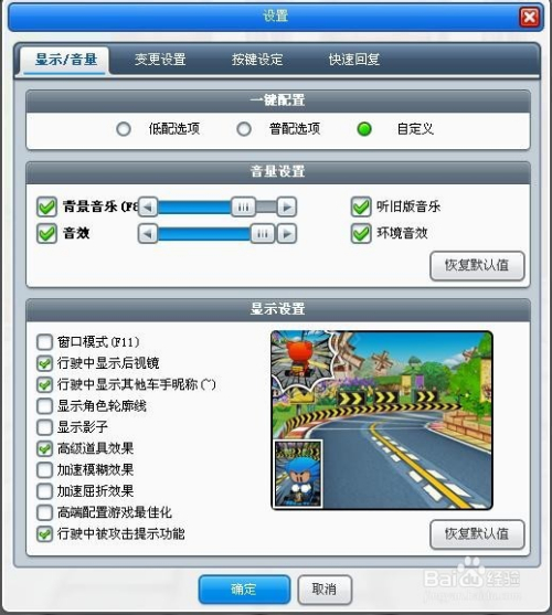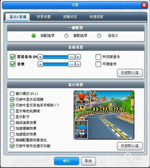 可利用系统预界说设置:低配选项和普配选项。也可以在“音量设置”和“显示设置”框中按照需要自行勾选,进行自界说设置装备摆设。