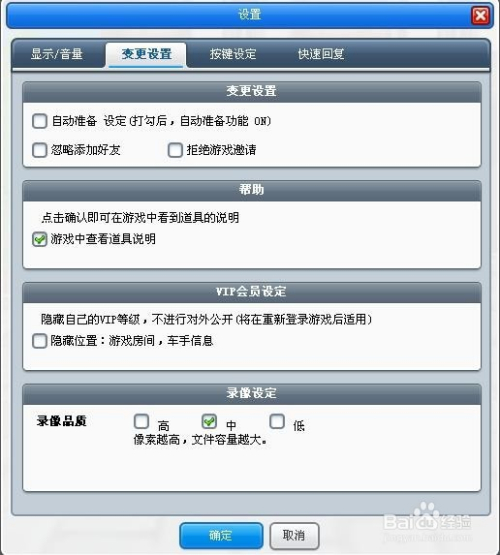 这个栏目中各个选项的意思很轻易大白,此中,"主动筹办"选项勾选后,进入游戏后主动筹办。而VIP会员设定,只有当作为VIP会员才可以利用。录像设定可对录像像素的凹凸进行设置。
