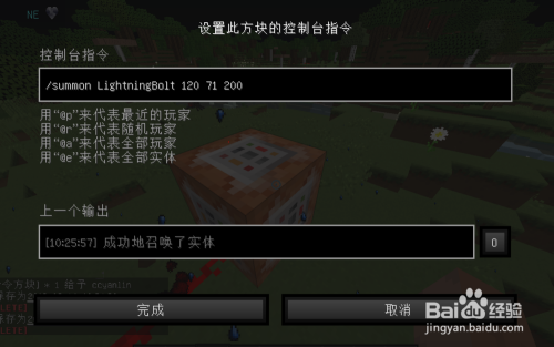 然后把号令方块放在地上,输入/summon LightningBolt (加你要呼唤的坐标就是xyz)就可以呼唤一个闪电