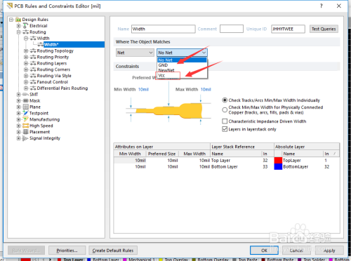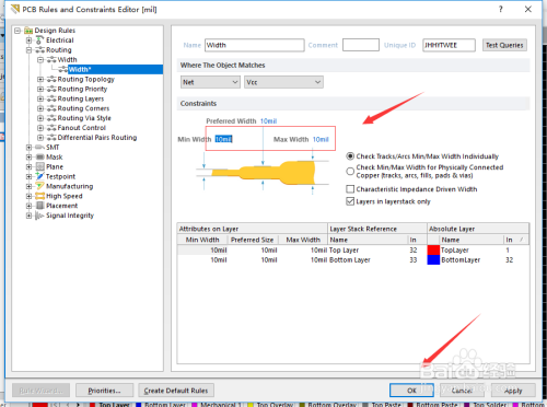 - 7选中后依次可以设置电源和地的最小和最年夜宽度了,然后点击apply如下图所示
