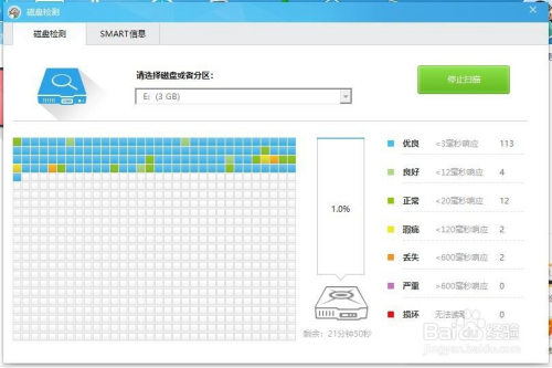 3GB的空间,检测总耗时为10分钟,具体的快慢与硬盘响应的快慢有关系,蓝色代表检测硬盘为出格快,耗时小。