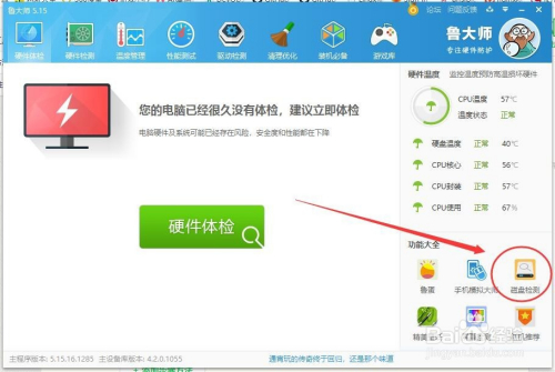 回归正题,我们此次教程的本家儿如果硬盘检测,本家儿界面右下角我们会看见一个图标叫硬盘检测,我们点击他。