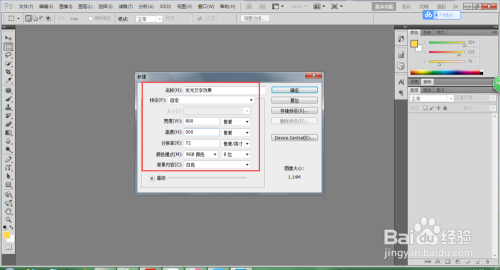 打开PS软件,选择新建号令,新建一个大小为800*500像素,分辩率为72像素每英寸的画布,点击确定进行建立。