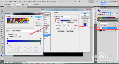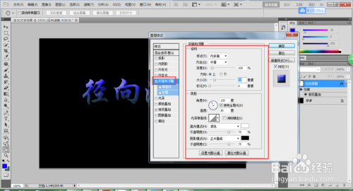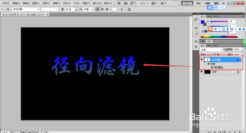 单击前景色,设置前景色的颜色为蓝色;在单击布景色,将布景色的颜色也进行更改;双击“径标的目的滤镜”文字图层,弹出图层样式窗口,选择渐变叠加样式,单击渐变叠加中的渐变条,选择前景色到布景色,单击确定,如许文字就有了一个渐变的填充。