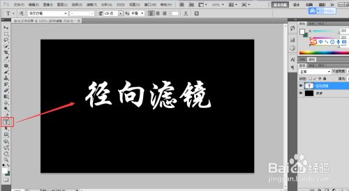 选择东西栏中的文本东西,在PS画布中心输入文字内容“径标的目的滤镜”,然后调整好文字的大小与位置等属性。