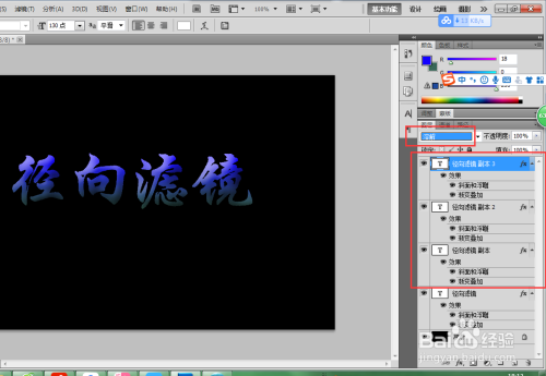 按住键盘上的辅助键Ctrl键,鼠标左键单击选中三个复制的图层,按Ctrl+E执行归并图层号令,将这三个复制的文字图层归并为一个通俗图层,并将归并后的图层的图层夹杂模式改为滤色。