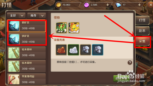在打开的窗口中,点击右侧的“采集”按钮,左侧列表中,可以看到“30级~49级”的铜矿区和铁矿区。