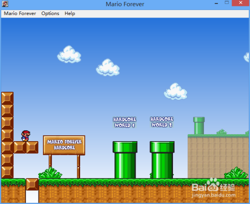 首先双击“Mario Forever.exe”,进入游戏。依次按照系统提醒操作,来到选关画面。进入选关画面从左至右第3个场景中标有“Hardcore World 2”的水管,即可起头游戏。