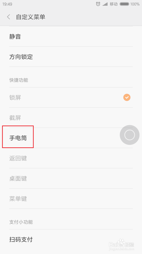 接下来,以图片中的例子来看,我们可以将锁屏功能替代为手电筒功能,点击对应的功能按钮即可完当作替代。