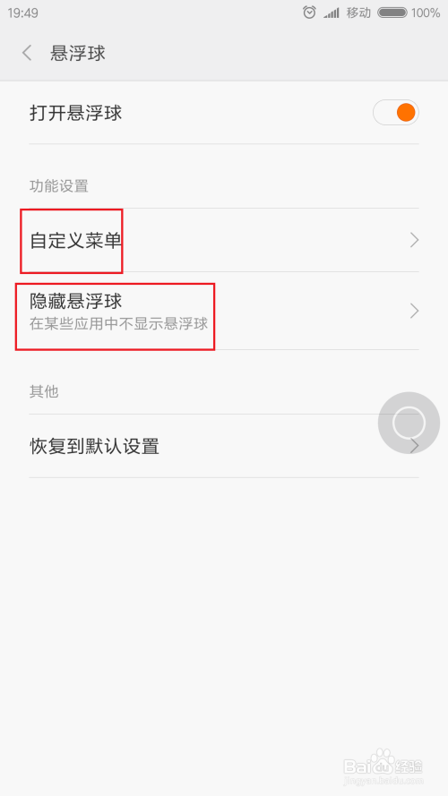 打开悬浮球功能之后,我们就可以进行设置了,点击页面中的“自界说菜单”选项,点击之后即可按照本身的爱好设置功能菜单。
