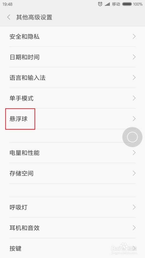 进入其他高级设置页面中,我们可以看到“悬浮球”设置选项,点击之后即可打开MIUI悬浮球设置页面。