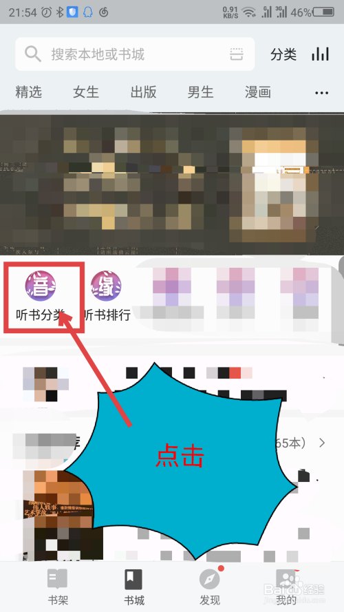 打开听书频道界面后,点击听书分类。操作如截图所示