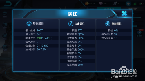 首先我们看下英雄属性,根本属性里最年夜生命3027.最年夜法力440,进犯属性里移速370,暴击结果200%,防御属性里每5秒回血27,每5秒回蓝15