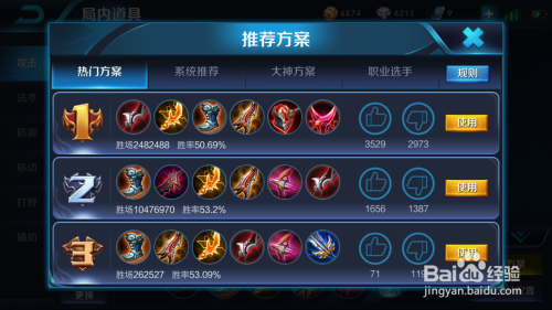 最后我们看下出装保举,别离是胜率排名前三的热点方案、系统保举方案、年夜神玩家方案及职业选手方案,大师都可以测验考试一下,选出最适合本身气概和打法的方案即可