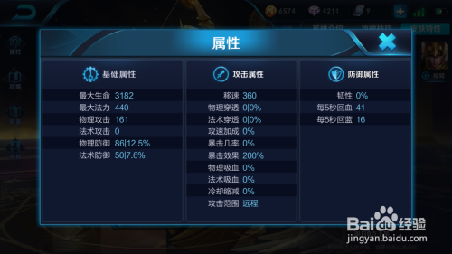 首先我们看一下该英雄的属性,根本属性里最年夜生命3182,最年夜法力440,进犯属性里移速360,暴击结果200%,防御属性里每5秒回血41,每5秒回蓝16