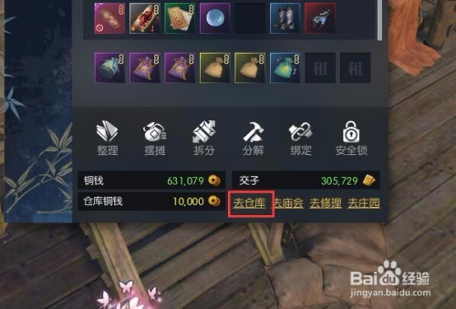 打开包裹后我们就可以在我们的包裹看到铜钱和仓库铜钱了,可是这里的并没有我们的冻结铜钱,我们需要去仓库办理员那才能领取冻结铜钱。