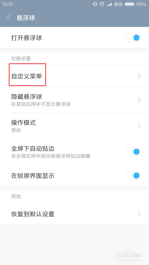 在悬浮球功能页面之后,我们可以看到“自界说菜单”按钮,点击之后,我们即可设置悬浮球的功能选项。