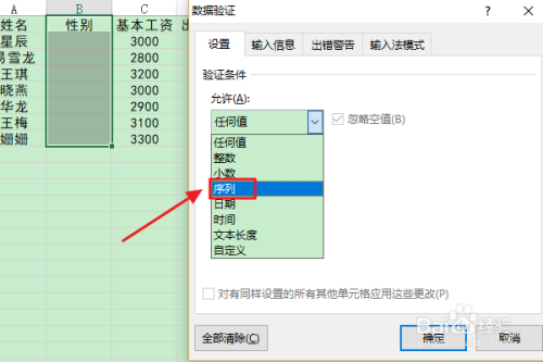 在数据验证下继续点击“数据验证”,接着在弹出的对话框我们选择“序列”,序列对应的“来历”处填写男,女即可(之间用英文输入时的逗号)