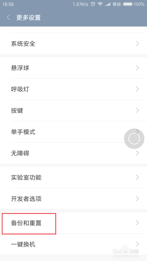 接下来,请大师在MIUI8的系统设置页面中,请大师标的目的下拉手机的设置选项,我们需要选择有关手机恢复的设置选项。