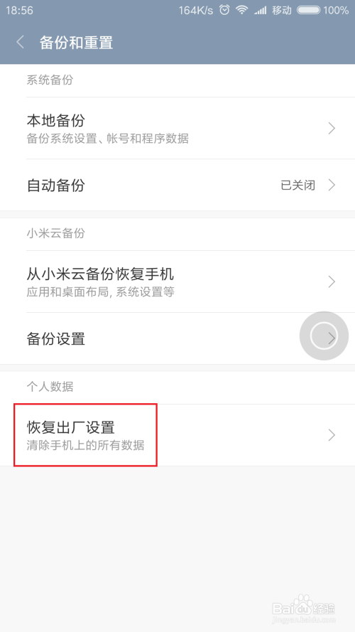 接下来,我们可以看到页面中的最后一项“恢复出厂设置”选项,点击之后即可选择三清手机中的全数数据。