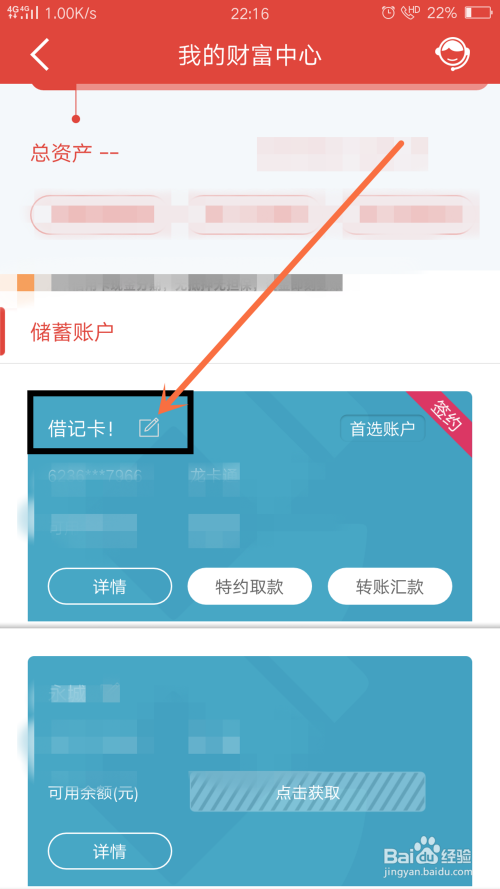 在小我财富中间-储蓄账户栏目,点击铅笔按钮,进入点窜卡名字,如图所示