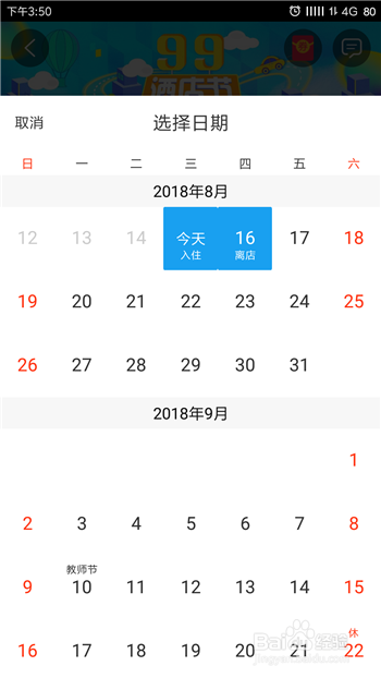 选择好城市后接着需要选择的是时候,包罗入住时候和分开的时候,选择好后点击【查询】。